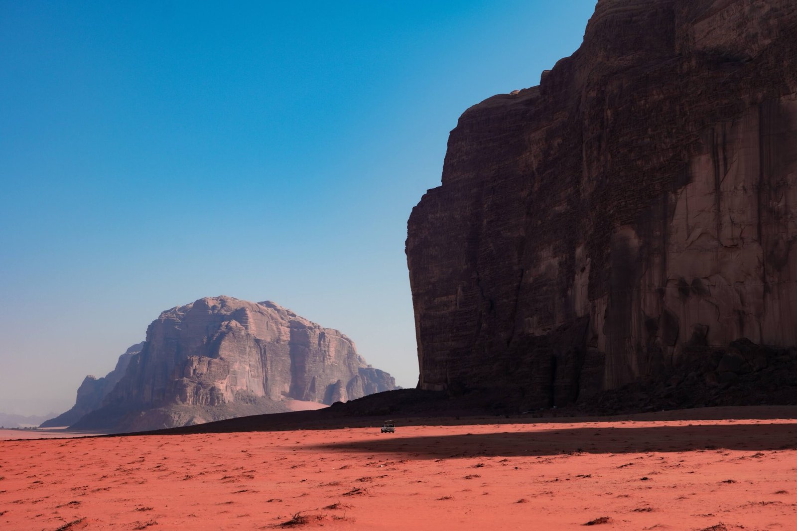 Ça y est. Cela fait seulement cinq jours que nous sommes en Jordanie mais nous sommes maintenant dans un autre monde. Nous nous réveillons avec le soleil vers 7h du matin, la fraîcheur a enfin gagné le milieu de la nuit, mais dès que le soleil apparaît, l’astre reprend ses droits sur cette terre. Nos guides nous embarquent aujourd’hui jusqu’au bout du désert, à la frontière, jusqu’en Arabie Saoudite. Cela n’a rien d’anodin dans ce milieu, le Nord du Wadi Rum est le plus accessible et donc le plus aménagé en encore nous nous engouffrons dans le territoire du silence et de l’infini.