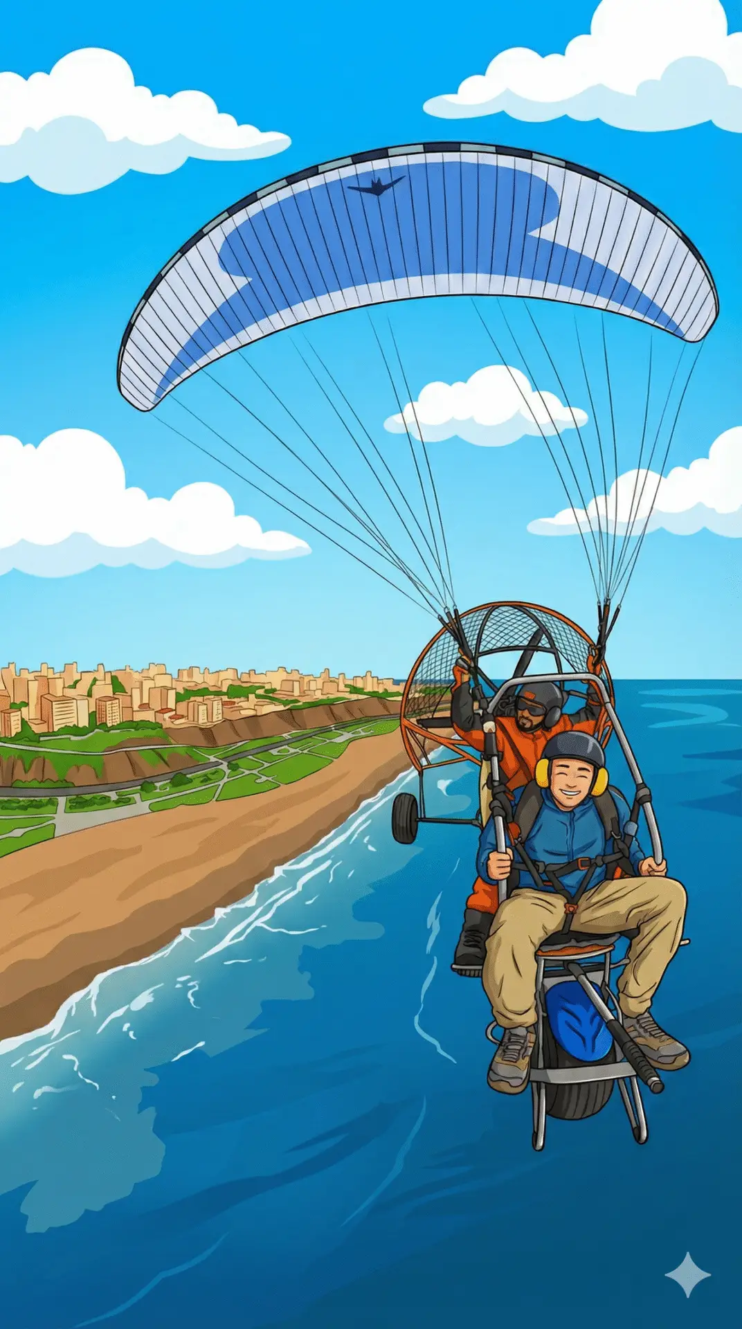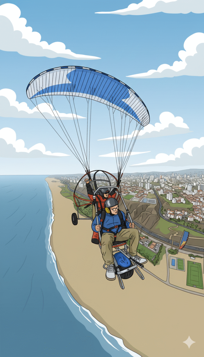 Après une sieste réparatrice sur le rooftop, direction les falaises de la Costa Verde. À 16h30 tapantes, je m’harnache pour un vol en parapente à moteur. Il y a beaucoup de vent. Trop ? Juste assez pour les sueurs froides du décollage. En quelques secondes, je quitte le sol. Je me retrouve à la hauteur des grands rapaces noirs qui patrouillent le ciel de Lima : les Gallinazos (Vautours noirs). Ils sont les gardiens de cette citadelle urbaine.
