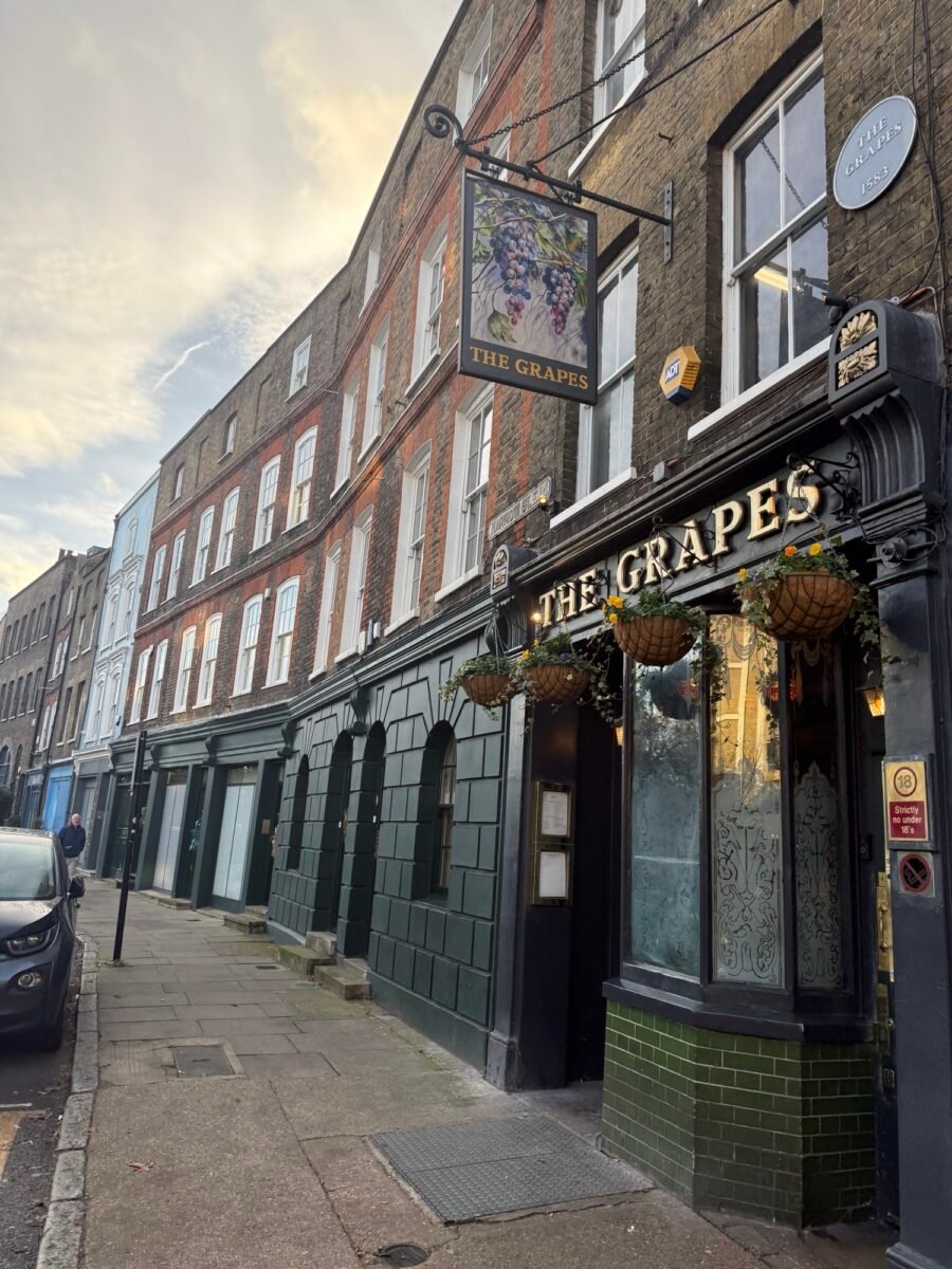 Nous finissons la journée au pub The Grapes à Limehouse. Fondé en 1583, c’est un bijou d’histoire, étroit et chaleureux.