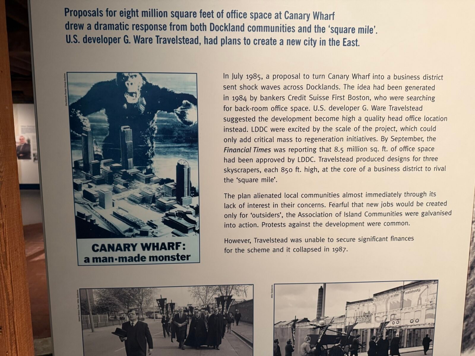 • Le Déclin : Bombardé par le Blitz allemand, puis rendu obsolète par l’arrivée des conteneurs (trop gros pour remonter la Tamise), le port ferme en 1980. Le quartier devient une friche sinistrée, rongée par le chômage.