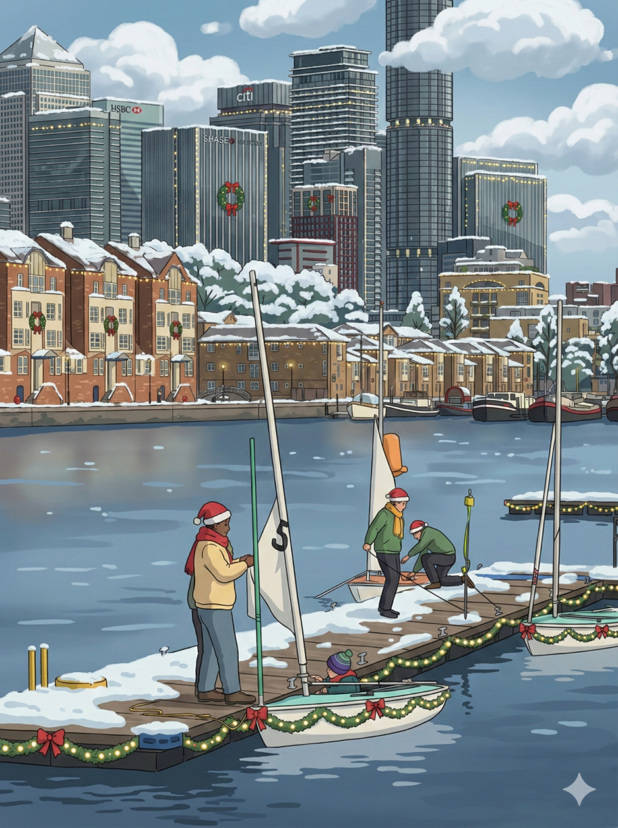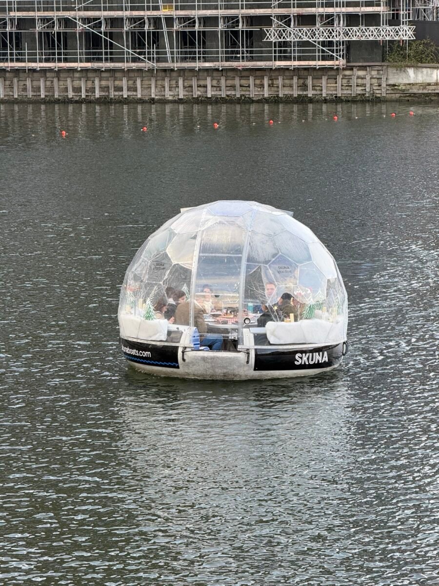 Dehors, l’esprit de Noël flotte… littéralement. Dans les anciens bassins, des groupes naviguent dans des bateaux ronds en forme de boules de Noël géantes (Skuna Boats), pique-niquant sur l’eau au pied des tours de verre.